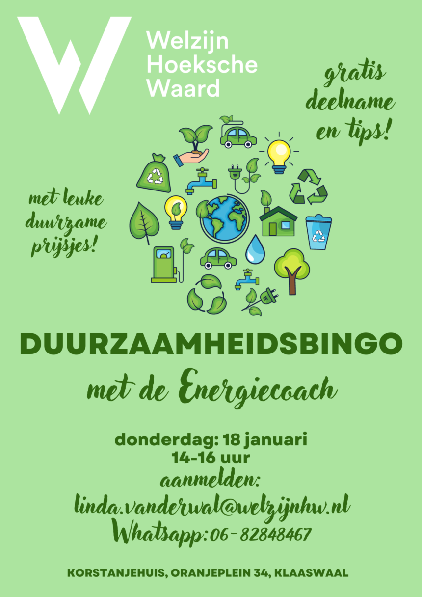 Verder is de duurzaamheidscoach van de gemeente aanwezig om tussen de bingorondes door indien gewenst de nodige informatie te geven. We zien u graag de 18e in het Korstanjehuis in Klaaswaal, Oranjeplein 34. Tijd: 14.00 uur- 16.00 uur. Deelname is gratis en aanmelden kan bij Linda van der Wal: [email protected] WhatsApp: 06-82848467