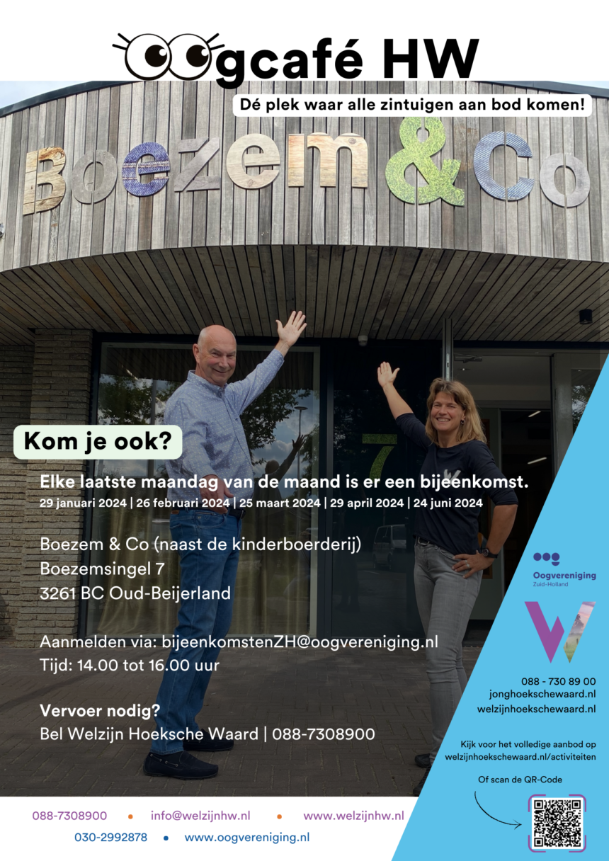Elke laatste maandag van de maand in 2024 wordt er een Oogcafé georganiseerd. Het Oogcafé Hoeksche Waard is dé plek waar alle zintuigen aan bod komen! Het café is in de eerste plaats bedoeld voor alle inwoners van de Hoeksche Waard en omstreken met een oogaandoening of zichtprobleem. Maar uiteraard zijn ook partners, familieleden, vrienden of andere geïnteresseerden van harte welkom. Ontmoet andere inwoners en wissel ervaringen en informatie uit onder het genot van een kop koffie of thee.