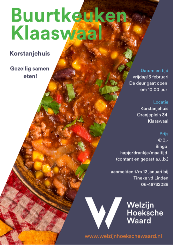 Vrijdag 16 februari is er weer een gezellige Buurtkeuken in het Korstanjehuis in Klaaswaal. Deze activiteit wordt georganiseerd door een groep enthousiaste vrijwilligers van Welzijn Hoeksche Waard. U bent vanaf 10.00 uur van harte welkom en de verwachting is dat het rond 13.15 uur weer afgelopen is.