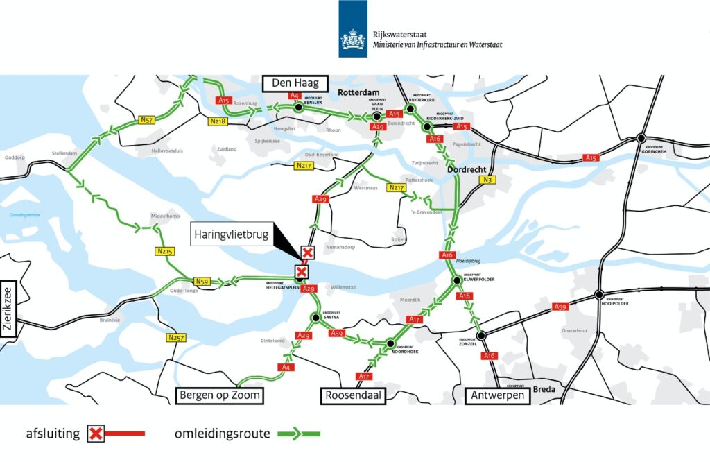 Tijdens de nachtafsluiting van de Haringvlietbrug wordt verkeer omgeleid via de A16(Moerdijkbrug) of via de N57 (Haringvlietdam). Verkeer van en naar de Hoeksche Waard kan tijdens de afsluiting tolvrij door de Kiltunnel (N217). Verkeer moet rekening houden met 30 minuten extra reistijd.