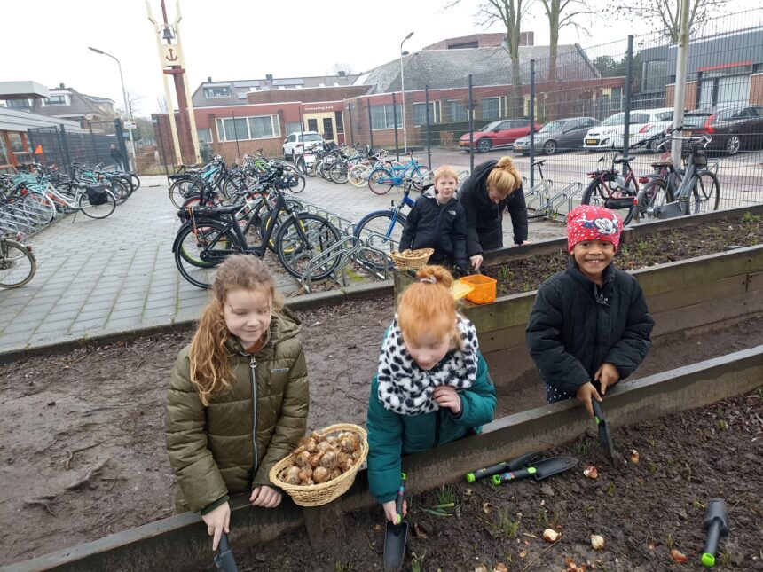 De kinderen hebben de bloembollen geplant in een deel van de schooltuin en in de aangrenzende grote bloembakken. Ze zien straks met eigen ogen hoe de bloembollen zullen uitgroeien tot schitterende bloemen met een uiteenlopend kleurenpalet.
