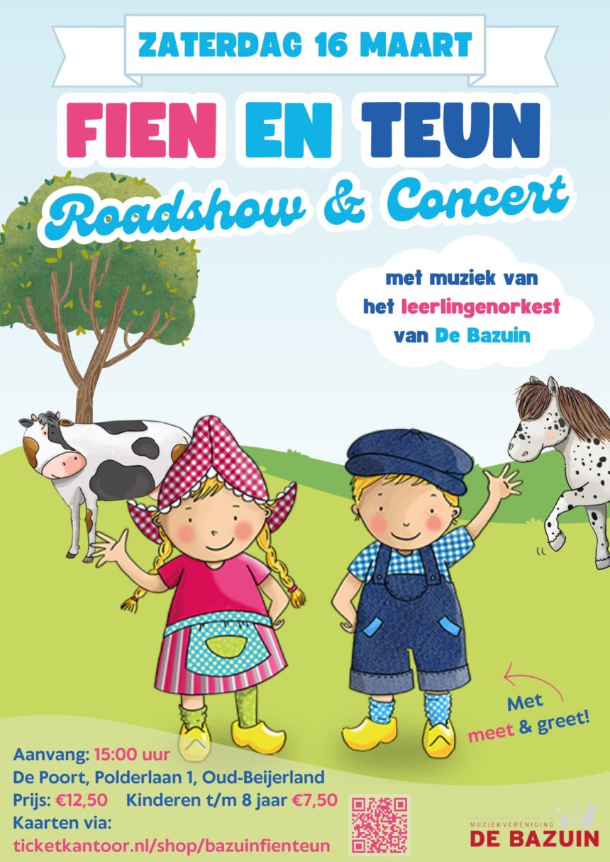 Tijdens het voorjaarsconcert van Muziekvereniging De Bazuin komen de twee vrolijke boerenkinderen uit het dorpje Molenwaard op bezoek in Oud-Beijerland. Tijdens een muzikale en humorvolle show leren Fien en Teun over dieren, eten en de natuur.