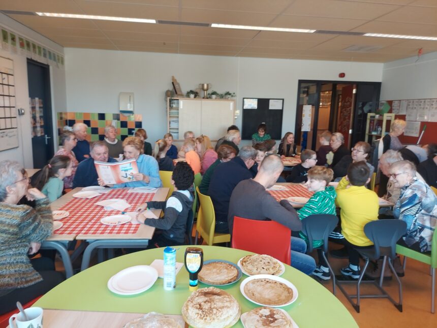 ‘Welkom opa’s en oma’s!’ staat op het digibord van groep 6A. In de klas van meester Owen is het een gezellige bedoeling. De tafels van de leerlingen zijn sfeervol gedekt en vooraan de klas staan stapels pannenkoeken. Als iedereen zit, nemen de leerlingen de bestelling van hun ‘gasten’ op en maken ze de pannenkoeken klaar. “Een mooi initiatief”, zegt meester Owen over de Nationale Pannenkoekdag. “En leuk om te zien dat er zo veel opa’s en oma’s zijn. Sommige kinderen konden geen opa of oma meenemen. Zij zijn hier met hun vader of moeder. Waar het om gaat, is dat we gezellig samenzijn. En dat we beseffen hoe belangrijk dit is. Eenzaamheid is binnen onze maatschappij een groeiend probleem. Daarover gaan we ook met de leerlingen in gesprek.”