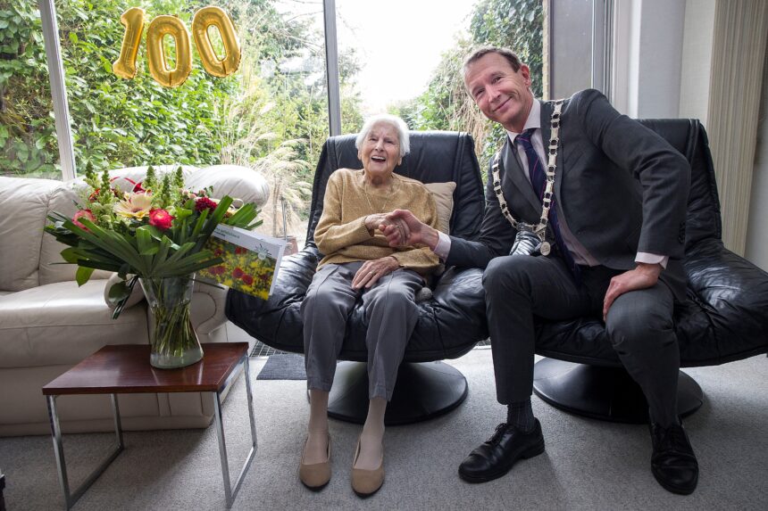 Mevrouw Witberg-Brinkman is zondag 17 maart 100 jaar geworden. Zondag kreeg ze bezoek van burgemeester Erik van Heijningen. Voor deze bijzondere verjaardag had de burgemeester een mooie bos bloemen en een doosje bonbons meegenomen. Namens het gemeentebestuur feliciteerde hij haar hartelijk met het bereiken van deze hoge leeftijd. Eigenlijk wil ze wel 103 worden, omdat ze flink ouder wil worden dan haar zus, die 101 is geworden. En ze weet wat ze daarvoor moet doen: blijven ademen.