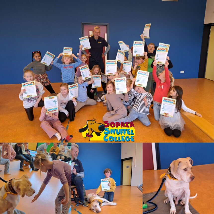 Groep 3/4 van IKC de Wereld op Noord in Oud-Beijerland volgde de lessen met Frank en zijn hond Bam. In de eerste les bracht Frank een pluchen hond mee die mocht blijven logeren. De tweede en derde les kwam ook de speciaal geteste Snuffelhond Bam mee de klas in. Kinderen leerden op een speelse manier en in hun eigen tempo de hondentaal begrijpen en daar goed op te reageren. En natuurlijk kreeg iedere deelnemer een prachtig diploma!