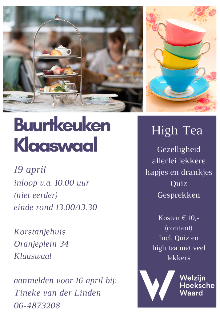 Naast een heerlijke high tea met allerlei zoete en hartige hapjes zal er koffie en thee geschonken werden en doen we een leuke quiz. Wilt u meegenieten van deze high tea dan kunt u zich aanmelden bij Tineke van der Linden t/m 16 april: 06-48732088. De kosten zijn € 10,- die ter plekke contant betaald kunnen worden. Korstanjehuis, Oranjeplein 34, Klaaswaal.