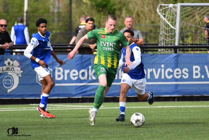 FC Binnenmaas begon zeer sterk aan de wedstrijd met de sterke wind die over het veld stond in de rug. Al in minuut 1 werd Rik Schouten door de weer sterk spelende Youri van Ruiven diep gestuurd maar zijn inzet werd een prooi voor de weer “vrijgesproken” doelman Mark Smith. En zo ging het eigenlijk de eerste twintig minuten zo door. Met goede loopacties in de diepte kwamen zowel Rik Schouten, Sander de Heus (werd zwaar gehinderd maar scheidsrechter Martins zag er geen penalty in) en Ricky Bokhoven kwamen oog in oog met doelman Smith te staan maar wisten hem niet te passeren. Maar na deze prima twintig minuten ging FC Binnenmaas meer slordig spelen en werden er ook geen loopacties in de diepte meer gemaakt. En zo kwam LMO steeds meer in de duels en zocht hierin vaak het randje op. Gescoord werd er niet in de eerste helft dus gingen de beide ploegen doelpuntloos aan de thee.