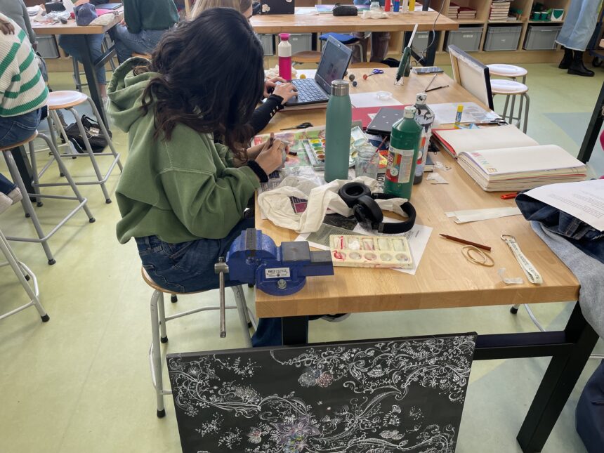 Het lichte en ruime Atelier in de school is de plek waar de leerlingen Kunst Beeldend de afgelopen maanden hard hebben gewerkt aan hun ontwerpen. Zij hebben het afgelopen jaar onderzoek gedaan naar de thema’s ‘Onderweg’ en ‘Kunstmatig’, concepten gemaakt en dat uitgebeeld in verschillende werken.