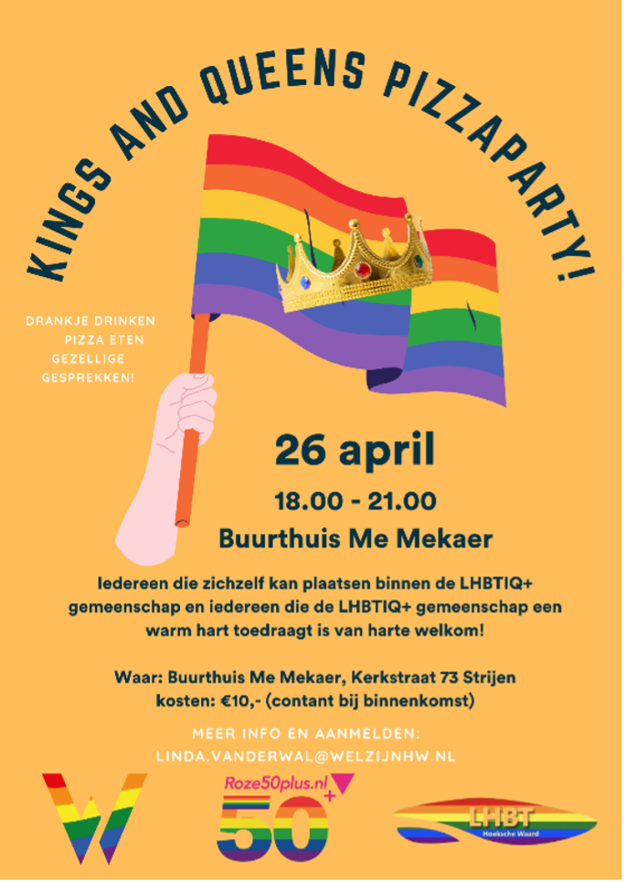 Op de avond voor Koningsdag organiseren Welzijn Hoeksche Waard, Roze 50+ en LHBTI HW een gezellige Kings and Queens Pizzaparty voor alle leeftijden op vrijdag 26 april. Iedereen is welkom: jong of oud(er), LHBTIQ+ . Belangrijk op deze avond vinden wij dat iedereen zichzelf mag en kan zijn. Er is inloop tussen 18.00 uur en 21.00 uur en we vragen een bijdrage van €10,- voor de pizza en drankjes. Aanmelden is fijn i.v.m. het bestellen van de pizza’s.