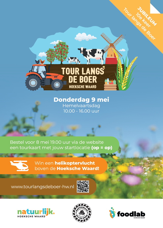 Tour langs de Boer viert in 2024 het 10 jarig jubileum. Er is daarom nog veel meer te doen. Vooral educatieve, kleinschalige bedrijfsbezoeken waarvoor van tevoren via www.tourlangsdeboer-hw.nl een ticket geboekt kan worden. De nieuwe opzet betekent dat er nog extra locaties open zijn met nog meer leuke activiteiten. Op Hemelvaartsdag een rondje fietsen? Boek een rondleiding bij Mariënhof/Weiderund, Totalis Naturales of Hoeksche Chips, help met melken in een echte melkstal, speel een potje boerengolf of stap op de fiets en doe een rondje langs de nieuwe rustpunten www.rustpunt.nu die in het fietsseizoen open zijn voor een bakkie koffie.
