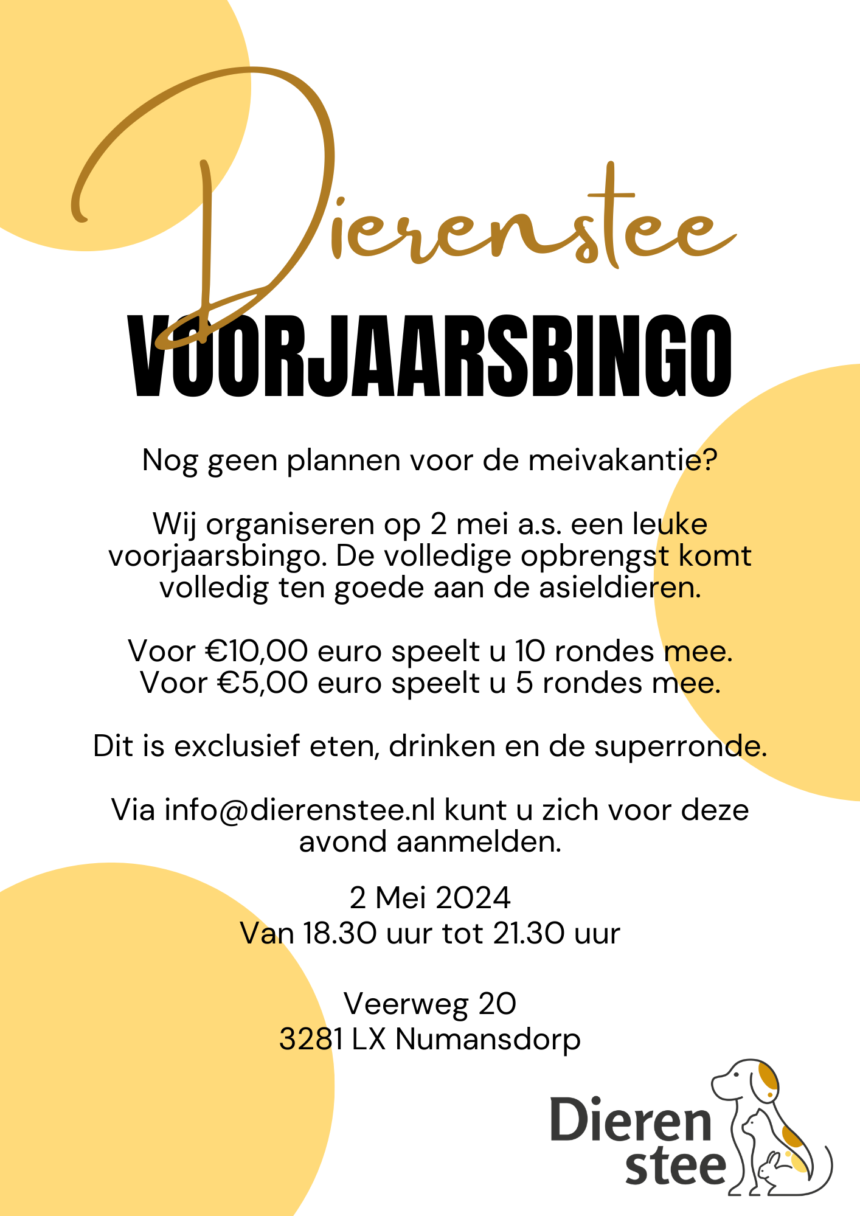 Op donderdag 2 mei aanstaande organiseert Dierenopvangcentrum De Dierenstee een voorjaarsbingo! Tijdens deze avond maken de deelnemers kans op mooie en bijzondere prijzen en tegelijkertijd steunt men met zijn of haar deelname het opvangcentrum.
