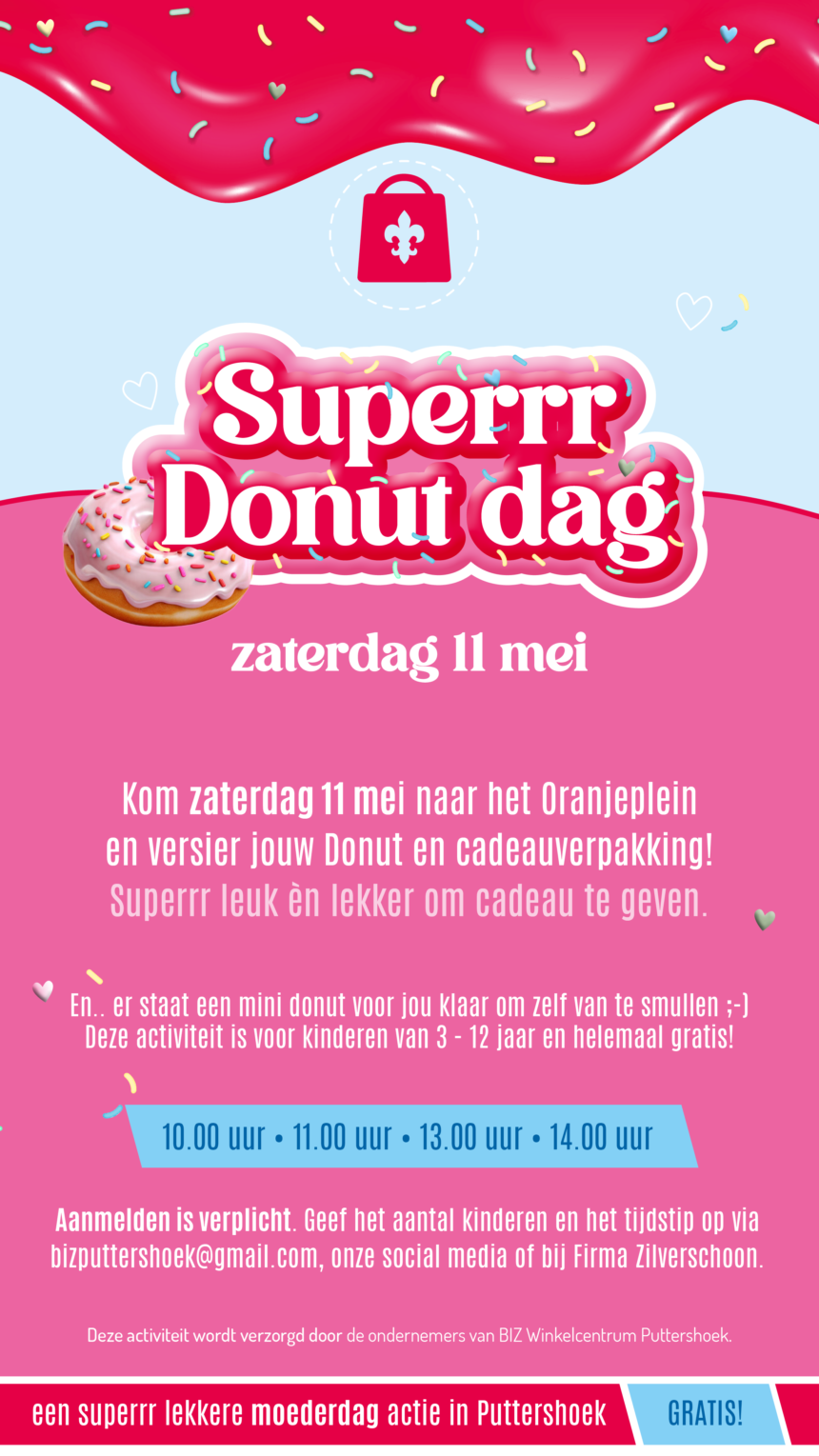 In Puttershoek is er op zaterdag 11 mei 2024 een leuke activiteit speciaal voor Moederdag. De kinderen, tussen 3 en 12 jaar, mogen een lekkere donut én een leuk doosje versieren voor mama, oma, tante of …. Zelf mogen de kinderen ook nog een mini donuts versieren en daarna lekker opeten.