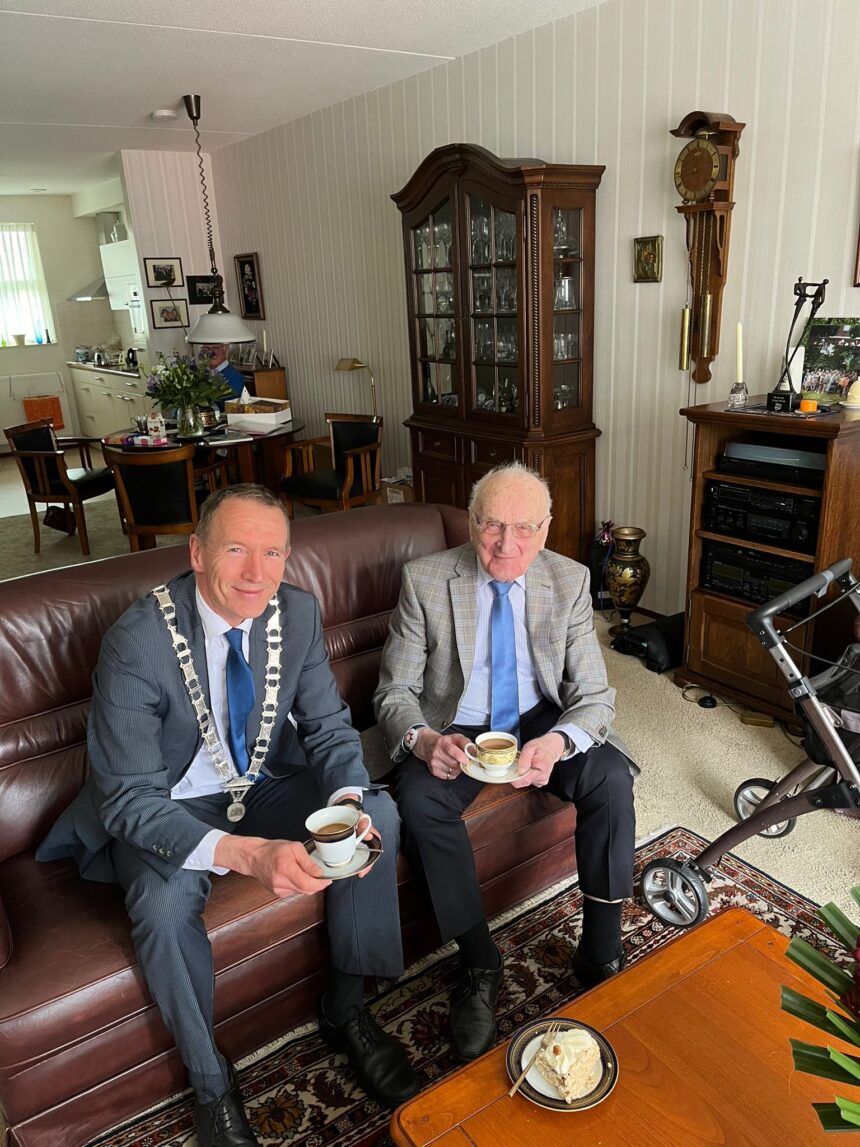 Gisteren is Arie den Hartog 101 geworden. Burgemeester Van Heijningen ging langs om hem te feliciteren met deze bijzondere mijlpaal. Namens het gemeentebestuur had hij een mooie bos bloemen en een doos bonbons meegenomen. Meneer Den Hartog is zelf 10 jaar burgemeester geweest. Herinneringen daaraan nam hij graag door met burgemeester Van Heijningen.
