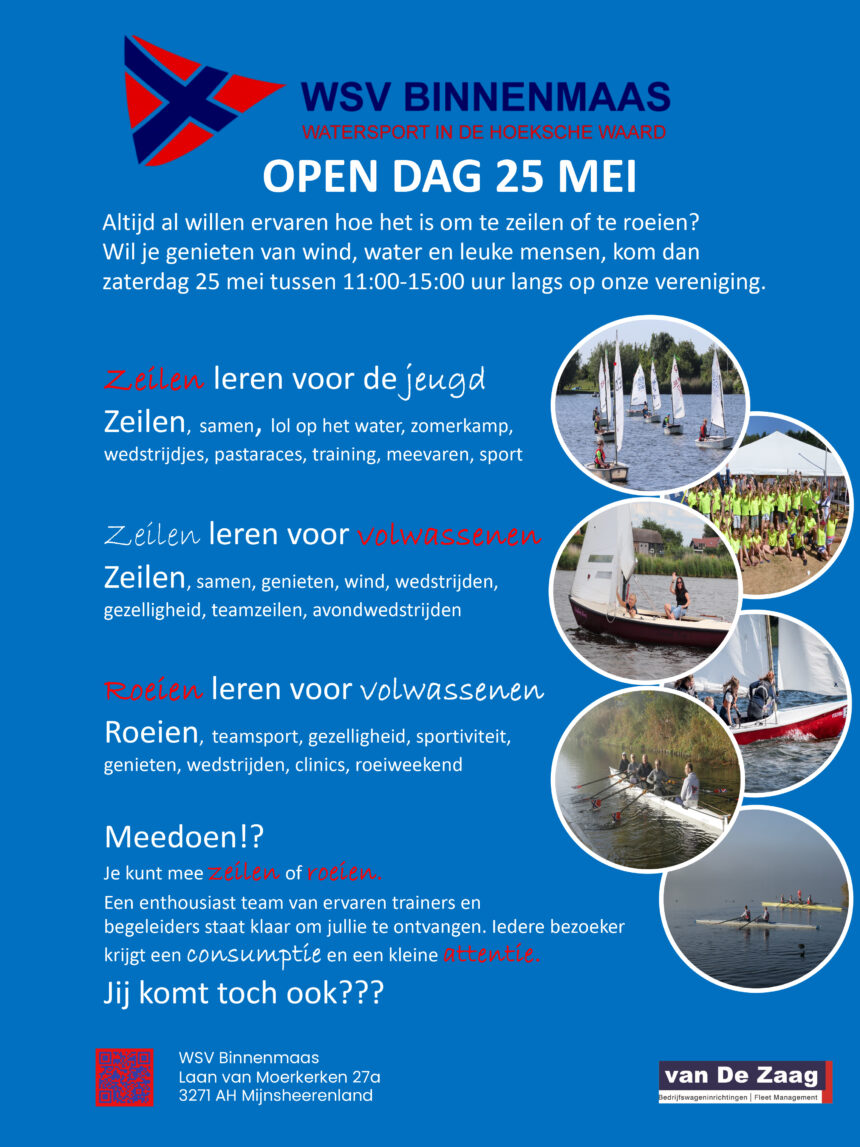 Op zaterdag 25 mei houdt WSV Binnenmaas een open dag van 11.00 uur tot 15.00 uur. Alle belangstellenden die kennis willen maken met de vereniging zijn van harte welkom.