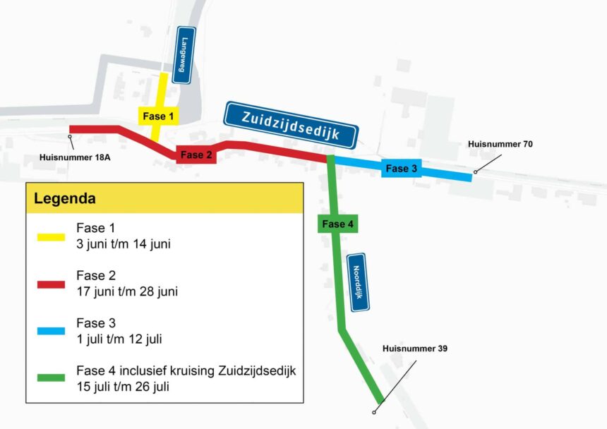 Het plan voor de uitvoering is zo gemaakt dat omliggende woningen en bedrijven zo min mogelijk hinder ervaren. De Versluys Groep voert het werk in 4 fases uit. Er is steeds maar een klein deel van de dijk of weg afgesloten. Iedere fase duurt ongeveer 2 weken. Het totale werk duurt 8 weken. Op 3 juni wordt gestart met fase 1: het deel tussen de Langeweg 4 en de kruising Zuidzijdsedijk (de kruising blijft open). Op het kaartje hiernaast ziet u de verschillende fases.