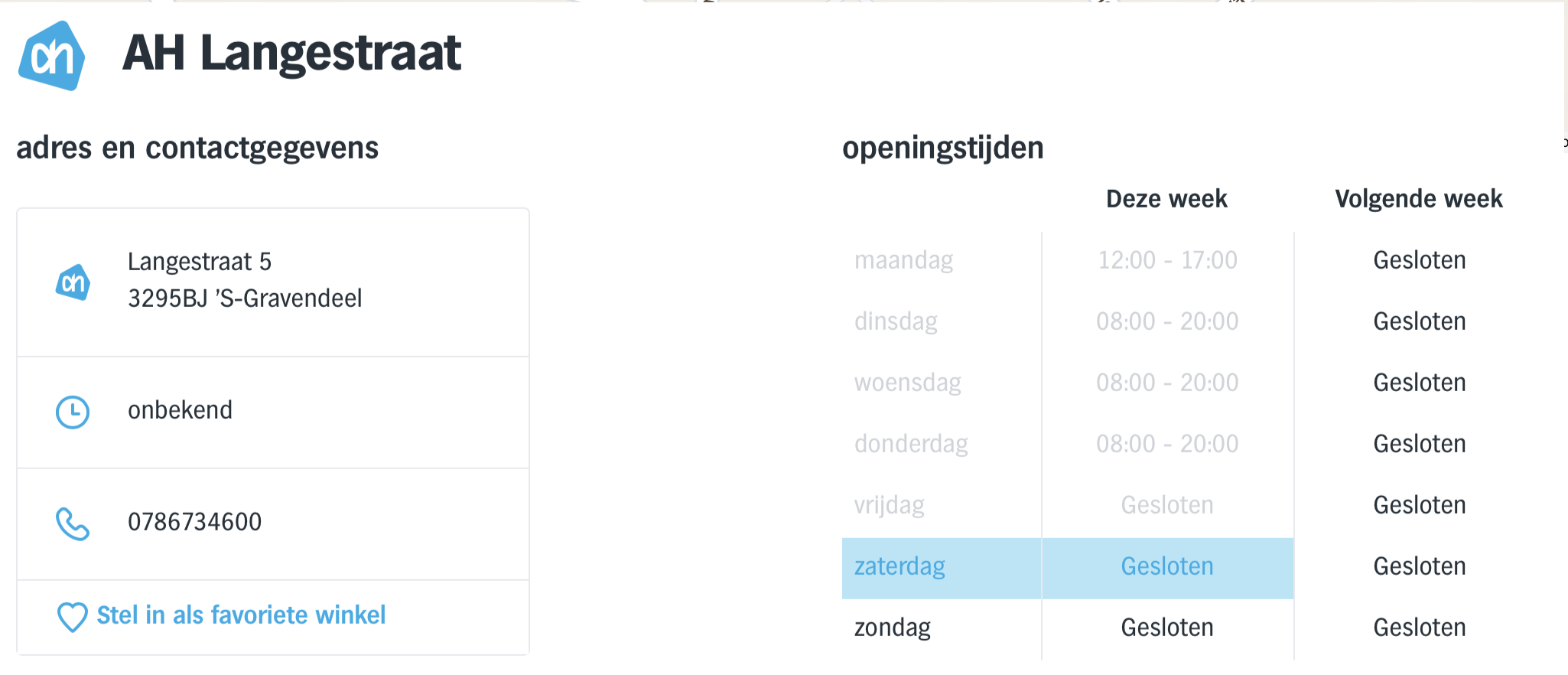 Het was even schrikken vrijdag voor inwoners uit ‘s-Gravendeel. De lokale Albert Heijn in ‘s-Gravendeel deed zijn deuren niet open en zoals het er nu naar uitziet de aankomende week ook niet is te lezen op de website van Albert Heijn. De reden van de plotselinge sluiting is niet bekend. Op Facebook reageren zelfs enkele medewerkers dat ze nu nu zonder werk zitten. Inwoners van ‘s-Gravendeel kunnen gelukkig uitwijken naar de plaatselijke Jumbo in het dorp. Update: Op zaterdagavond 19.00 uur kwam het hoofdkantoor van Albert Heijn met een reactie klik daar voor hierklik daar voor hier.