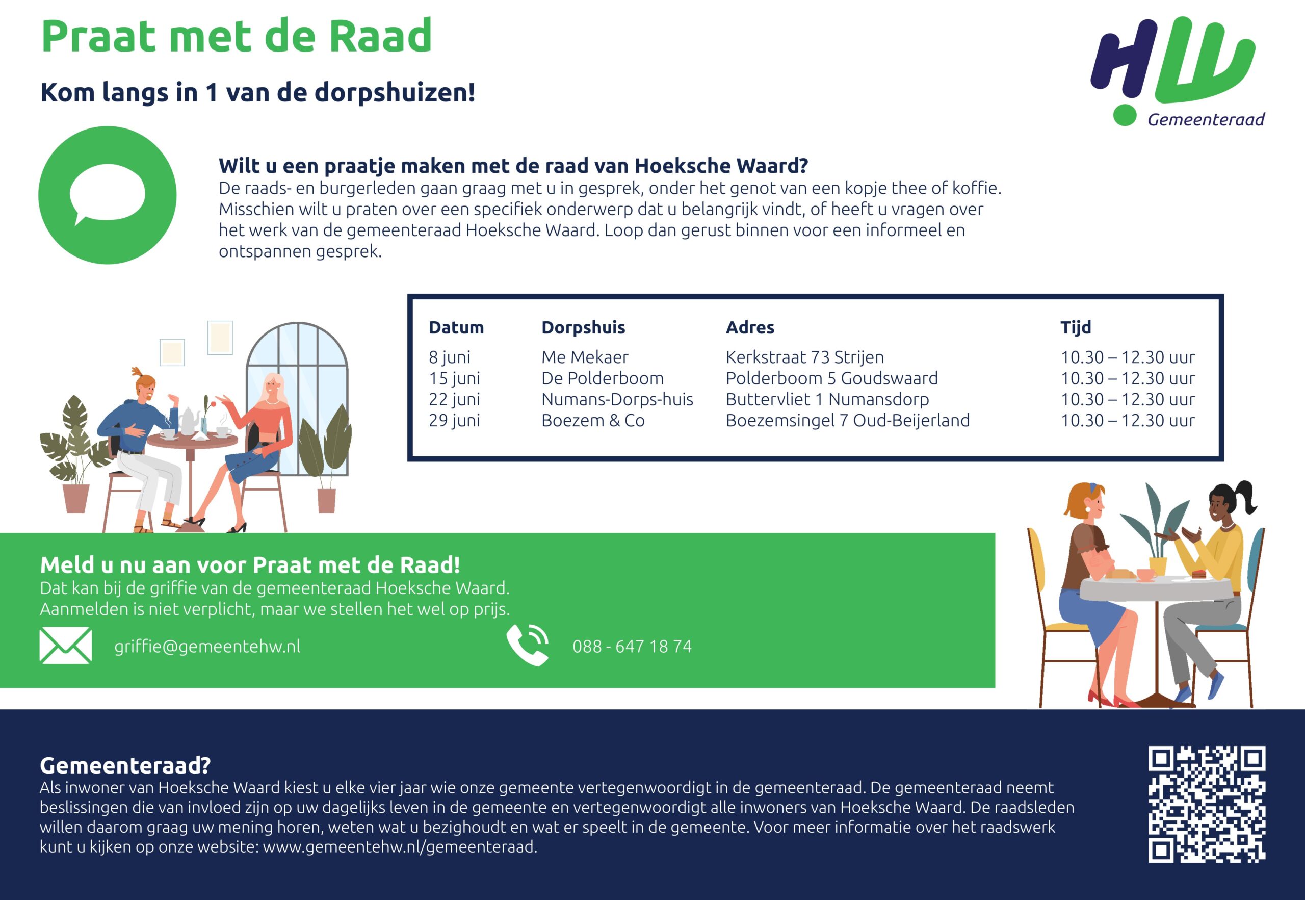 Wilt u een praatje maken met de raad van Hoeksche Waard? De raads- en burgerleden gaan graag met u in gesprek, onder het genot van een kopje thee of koffie. Misschien wilt u praten over een specifiek onderwerp dat u belangrijk vindt, of heeft u vragen over het werk van de gemeenteraad Hoeksche Waard. Loop dan gerust binnen voor een informeel en ontspannen gesprek.