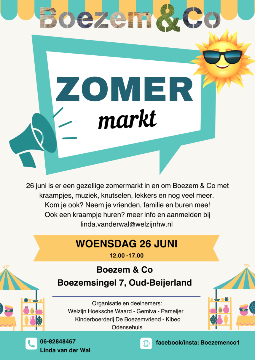 Zet in de agenda! Woensdag 26 juni organiseren de gebruikers van Boezem & Co, Welzijn HW, Gemiva, Pameijer, Odensehuis, Kibeo en De Boezemvriend, een leuke zomermarkt in Boezem & Co van 12.00 uur tot 17.00 uur. Je vindt er diverse kraampjes, muziek, knutselen, lekkers en nog veel meer.