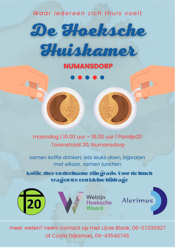 Samen koffie drinken, iets leuks doen, bijpraten met elkaar, samen lunchen. Dat is een greep uit wat er gebeurt op een dag in de Hoeksche Huiskamer die u kunt vinden in Pandje20 aan de Torenstee 20 in Numansdorp. Koffie en thee zijn gratis. Wilt u mee lunchen? Dan vragen we een bijdrage van €2,50. Alleen de ochtend of middag komen of alleen mee lunchen? Allemaal mogelijk! Aanmelden is niet nodig. Meer weten? neem contact op met Lijnie Blaak, 06-57330927 of Corrie Dijksman, 06-43540745