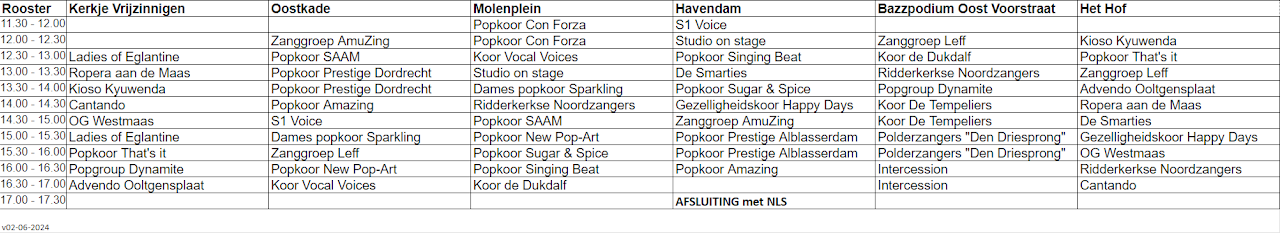 Wederom een keur aan muziekstijlen en samenstellingen. Zanggroepen van 10 personen en koren van 80 personen. Dit jaar is er een nieuw podium in het pittoreske Hof en staat er aan het Havenplein een groot podium waar ook de feestelijke afsluiting plaatsvindt met Accordeonorkest NLS. Kortom gegarandeerd weer veel mooie muziek en een heerlijke middag in het centrum van Oud-Beijerland.