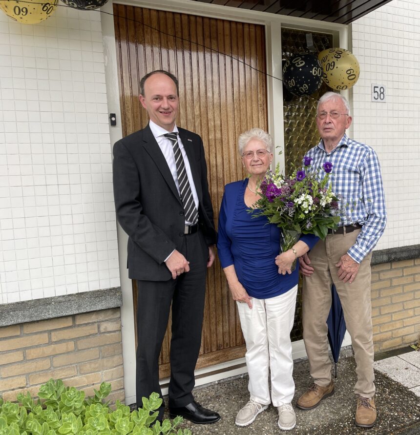 Het was dinsdag 18 juni, 60 jaar geleden dat meneer W.H. Noordzij (84) en mevrouw G.C.C. Noordzij-de Kok (83) uit Strijen in het huwelijksbootje stapten. Wethouder Adriaan van der Wulp ging gisterenmiddag langs met een mooie bos bloemen. Hij feliciteerde hen namens het gemeentebestuur met dit diamanten jubileum.