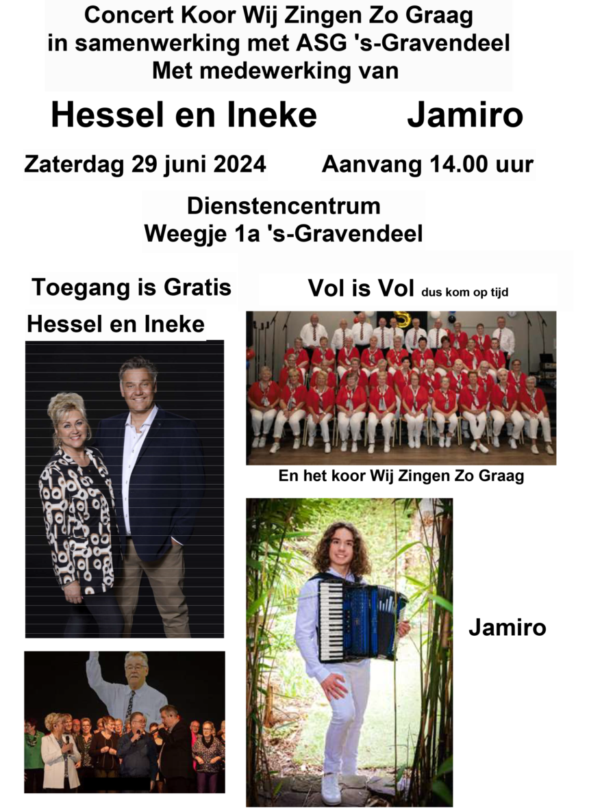 Het koor Wij Zingen Zo Graag organiseert op zaterdagmiddag 29 juni in het dienstencentrum in ’s-Gavendeel een middag voor fans en belangstellende in samenwerking met ASG ’s-Gravendeel Buiten het koor werken het Duo Hessel en Ineke en Jamiro op accordeon mee aan deze middag om 13 uur gaat de zaal open aanvang is 14.00 uur toegang is GRATIS.