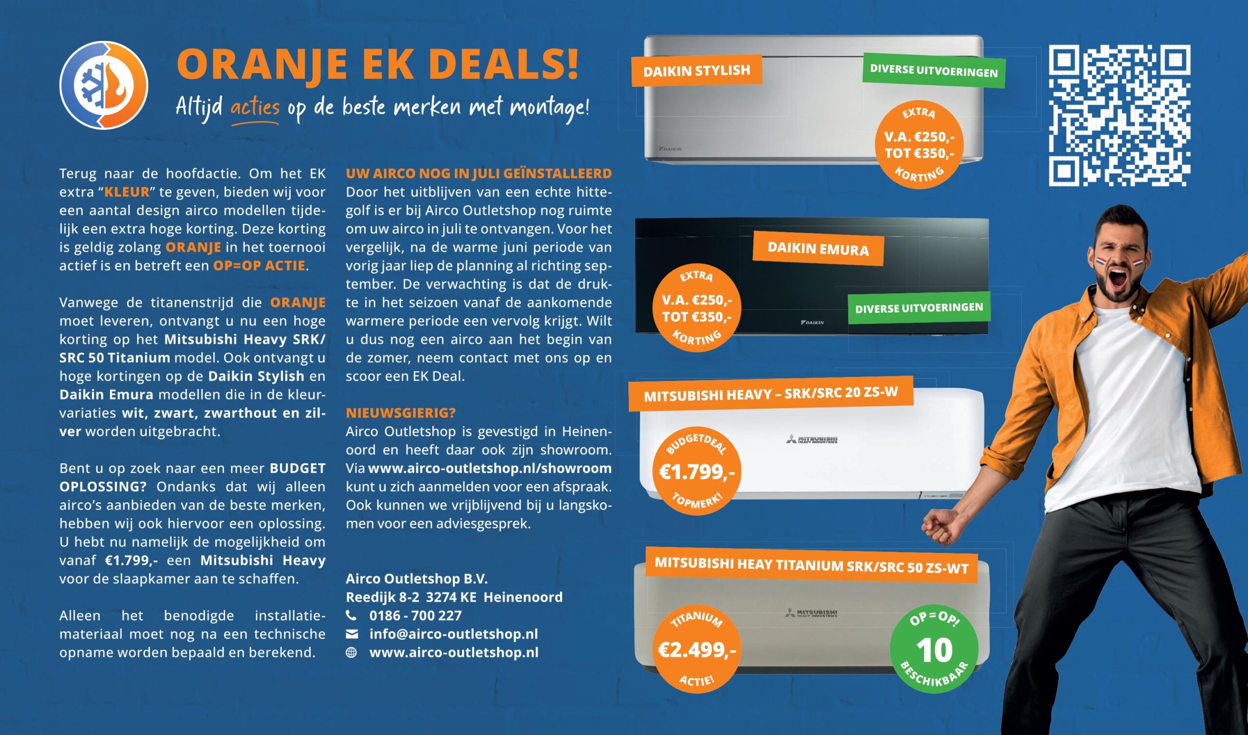 Terug naar de hoofdactie. Om het EK extra “KLEUR” te geven, bieden wij voor een aantal design airco modellen tijdelijk een extra hoge korting. Deze korting is geldig zolang ORANJE in het toernooi actief is en betreft een OP=OP ACTIE.