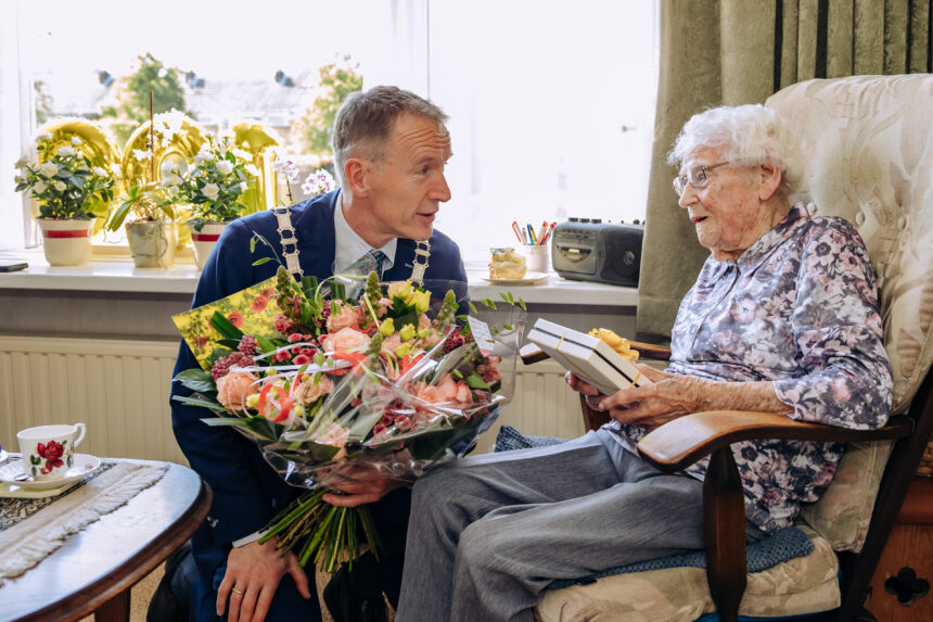 Mevrouw Vos-den Tuinder is vandaag 100 jaar geworden. Vanochtend kreeg ze bezoek van burgemeester Erik van Heijningen. Voor deze bijzondere verjaardag had de burgemeester een mooie bos bloemen en een doosje bonbons meegenomen. Namens het gemeentebestuur feliciteerde hij haar hartelijk met het bereiken van deze hoge leeftijd. Haar gezondheidstip voor een lang leven: “Bezig blijven en blijven ademhalen.”