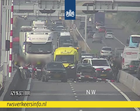 De betrokken voertuigen worden geborgen en de monteur komt nog ter plaatse voor de slagboom. De vertraging is nu 30 minuten maar dit zal afnemen. Omrijden is niet meer nodig.