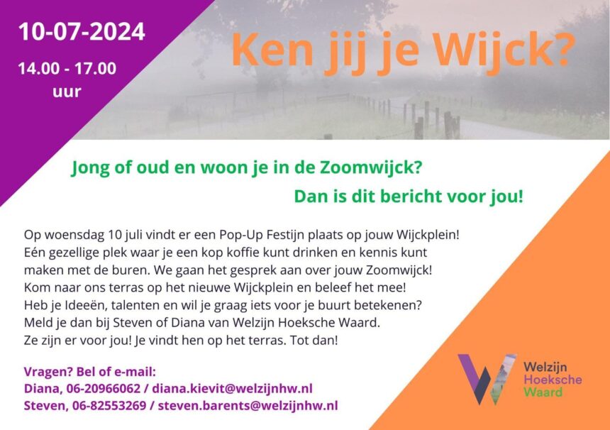 Ken je je buren en je wijkgenoten? Ken je hun talenten en mogelijkheden? Wie heeft er toffe ideeën en wat heb je dan nodig om die zelf en/of samen uit te voeren? Wat vind je van wonen in de Zoomwijck? Wat gaat goed en wat kan beter? Waar liggen kansen en wie kan daarin iets betekenen? Wat wil jij betekenen voor een ander?