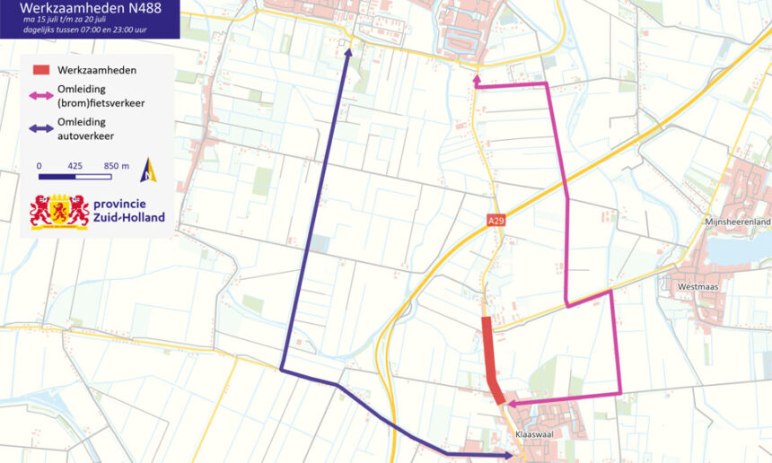 Van 15 juli tot en met 20 juli 2024 werkt de Provincie Zuid Holland op de Molendijk (N488) in Klaaswaal. De weg is dan deels afgesloten. Het verkeer volgt dan omleidingen.
