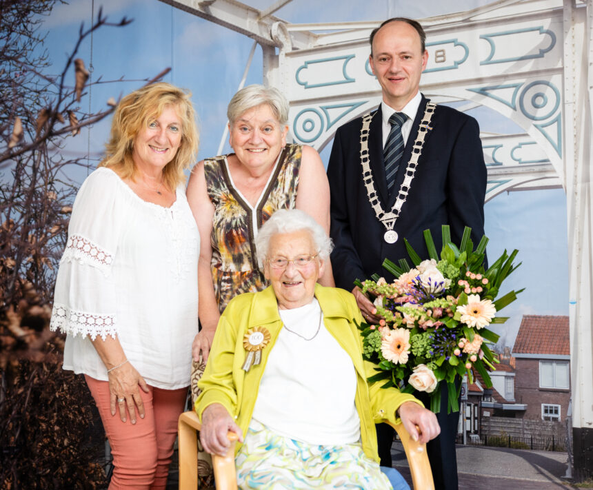 Mevrouw P. Notenboom-Kruithof is op 27 juli 100 jaar geworden. Locoburgemeester Adriaan van der Wulp ging vanochtend bij haar op bezoek. Voor deze bijzondere verjaardag had de locoburgemeester een mooie bos bloemen en een doosje bonbons meegenomen. Namens het gemeentebestuur feliciteerde hij haar hartelijk met het bereiken van deze hoge leeftijd.