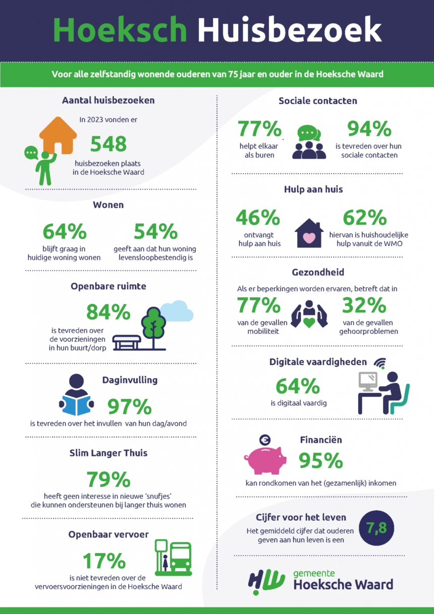 Alle informatie uit deze huisbezoeken is anoniem verwerkt in een rapportage. Deze informatie brengen de ouderenadviseurs van de gemeente onder de aandacht bij verschillende afdelingen binnen de gemeente en bij verschillende organisaties in de Hoeksche Waard. Graag delen we de uitkomsten hiervan met u. De volledige rapportage van de huisbezoeken is te lezen in de Rapportage uitkomsten Hoeksch huisbezoek 2023 Gemeente Hoeksche Waard.
