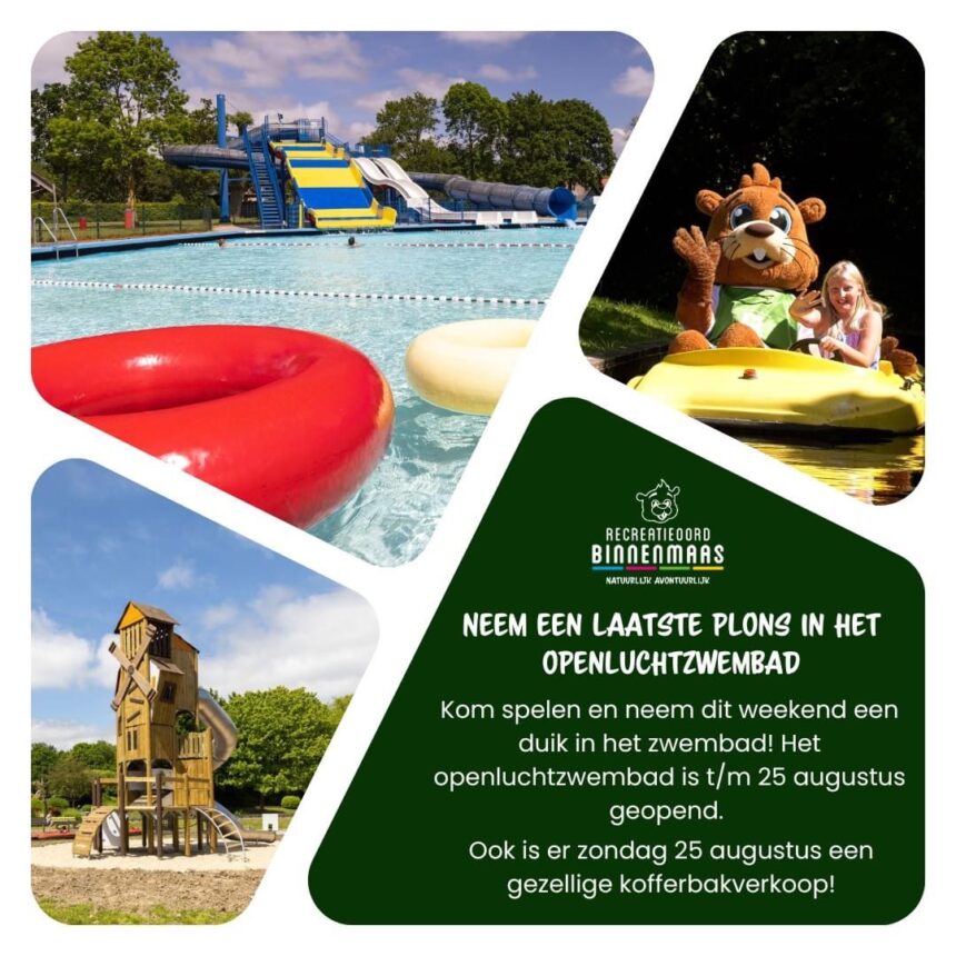 Zondag 25 augustus wordt het zwembadseizoen feestelijk afgesloten, en er staat niet alleen zwemmen op het programma. Op het evenemententerrein vindt die dag ook een gezellige kofferbakverkoop plaats, waar bezoekers kunnen struinen langs kraampjes vol koopjes.