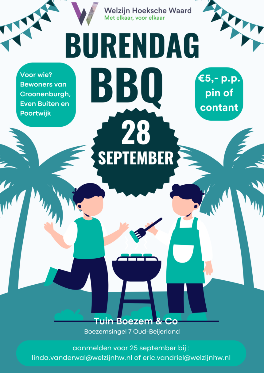 Zaterdag 28 september organiseert Welzijn Hoeksche Waard met bewoners een gezellige Burendag BBQ! Woont u in de wijken Croonenburg, Poortwijk of Even buiten en wilt u tijdens een gezellige BBQ uw medebewoners ontmoeten of vindt u het leuk om mee te helpen? Meld u dan nu aan bij [email protected] of bij [email protected] . Er wordt een bijdrage gevraagd van €5,-. Boezem & Co, Boezemsingel 7, Oud-Beijerland