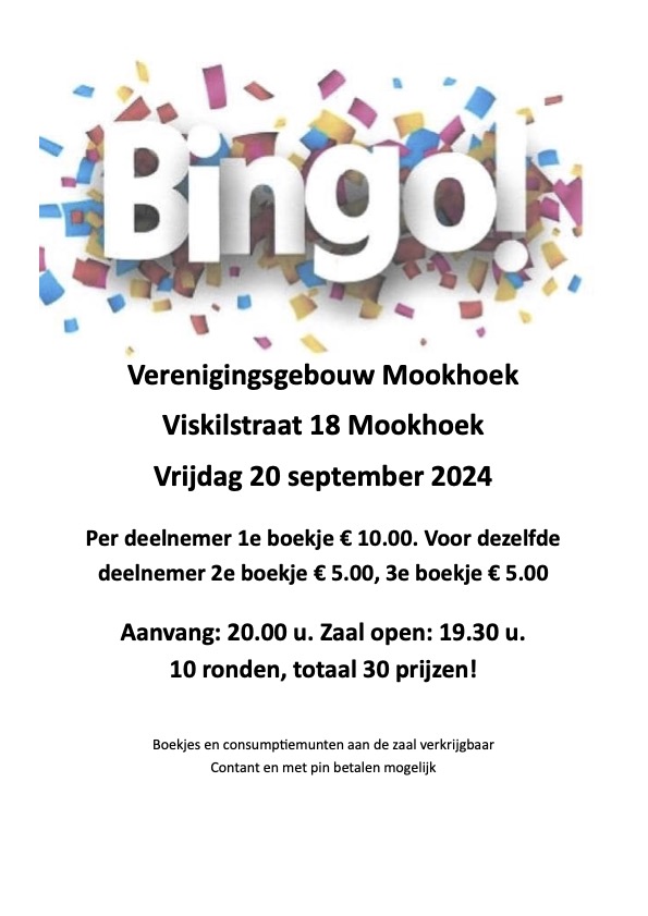 Mookhoek – Op vrijdag 20 september 2024 wordt er een gezellige bingoavond georganiseerd in het Verenigingsgebouw Mookhoek, gelegen aan de Viskilstraat 18. De deuren openen om 19:30 uur en het spel begint om 20:00 uur.