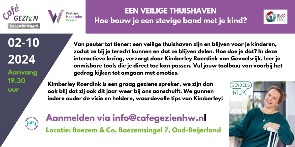 Van peuter tot tiener: een veilige thuishaven zijn en blijven voor je kinderen, zodat ze bij je terecht kunnen en dat ze blijven delen. Hoe doe je dat? In deze interactieve lezing, door Kimberley Roerdink van Gevoelsrijk, leer je onmisbare tools die je direct kunt toepassen. Vul jouw toolbox; van voorbij het gedrag kijken tot omgaan met emoties.