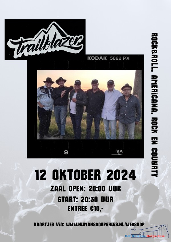 Op zaterdag 12 oktober 2024 speelt de upcoming band Traillblazer in het Dorpshuis van Numansdorp. De zes-koppige formatie brengt een unieke mix van country, americana, rock en rock & roll. Met een gevarieerd repertoire, waaronder nummers van Buddy Miller, JJ Cale en Dwight Yoakam, belooft het een avond vol muzikale verrassingen te worden.