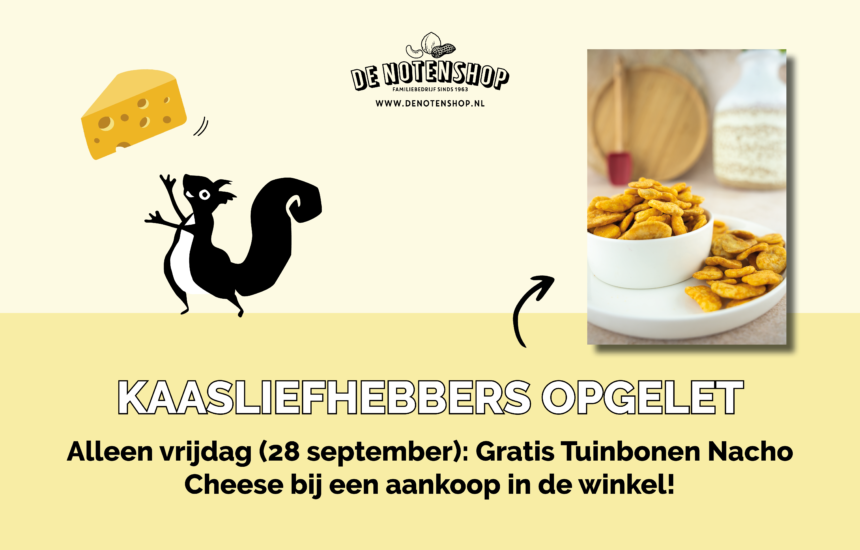 Wist je dat je sinds 16 september de lekkerste producten van De Notenshop niet alleen meer online kan verkrijgen, maar ook in de nieuwe winkel? En dan nog een leuk extraatje voor alle kaasliefhebbers: alleen deze vrijdag (27 september) krijgt iedere klant in de winkel een gratis zakje Tuinbonen in de smaak Nacho Cheese cadeau bij een aankoop. Hoe leuk is dat?!