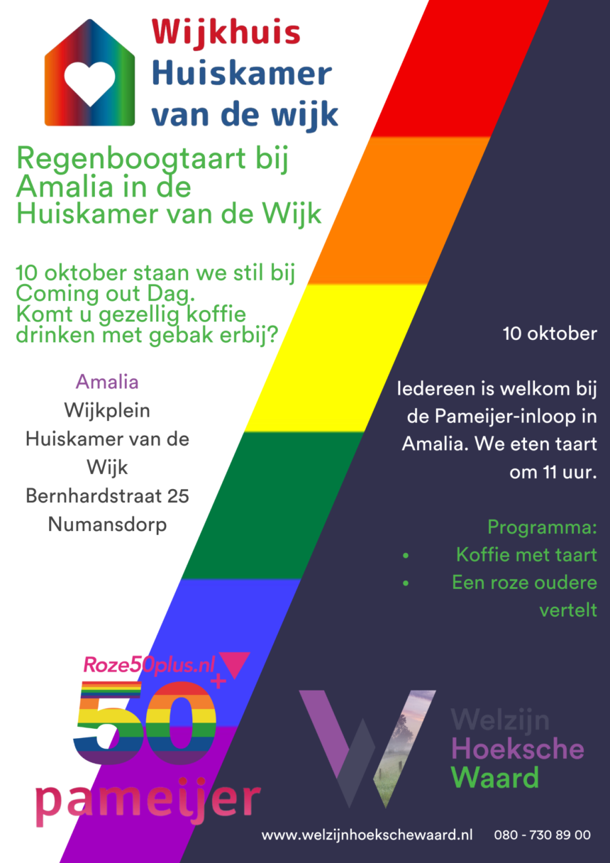 Iedereen is welkom om lekker een bakje koffie of thee te komen drinken met een regenbooggebakje erbij. Ook zal iemand komen vertellen over hoe het is om op oudere leeftijd uit de kast te komen. We zien u graag in Amalia, Bernhardstraat 25 in Numansdorp, om 11 uur op de 10e oktober. Deelname is gratis en aanmelden niet nodig. Meer informatie: Linda van der Wal, [email protected] 06-82848467 Deze bijeenkomst wordt georganiseerd door Welzijn Hoeksche waard, Wijkhuis Huiskamer van de Wijk, Pameijer en Roze 50+.
