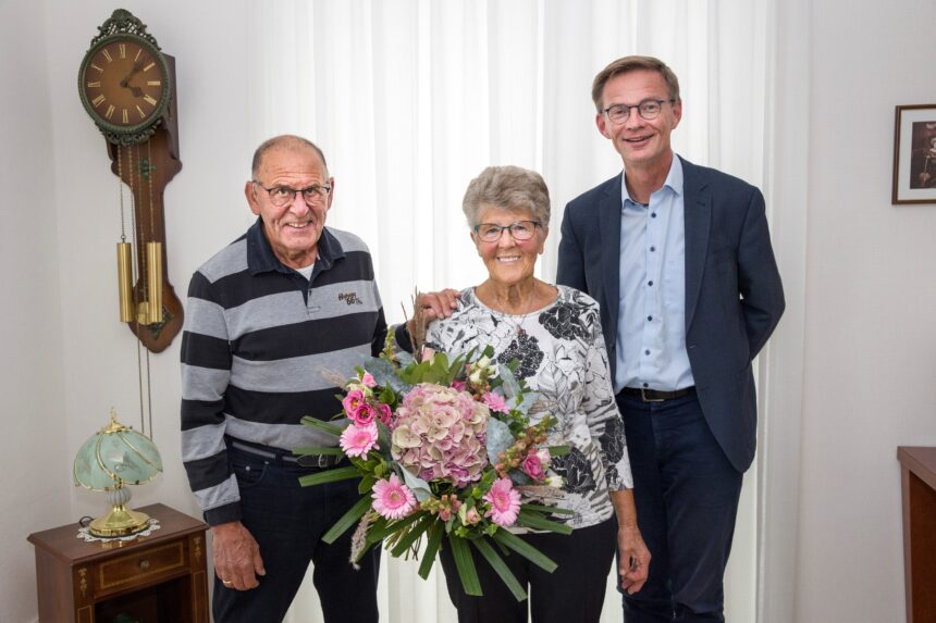 Het was dinsdag , 1 oktober, 60 jaar geleden dat de heer J. Overweel (83) en mevrouw L.K. Overweel-van Putten (83) uit Oud-Beijerland elkaar het jawoord gaven. Wethouder Harry van Waveren ging gisterenmiddag langs met een mooie bos bloemen. Hij feliciteerde hen namens het gemeentebestuur met dit diamanten jubileum.