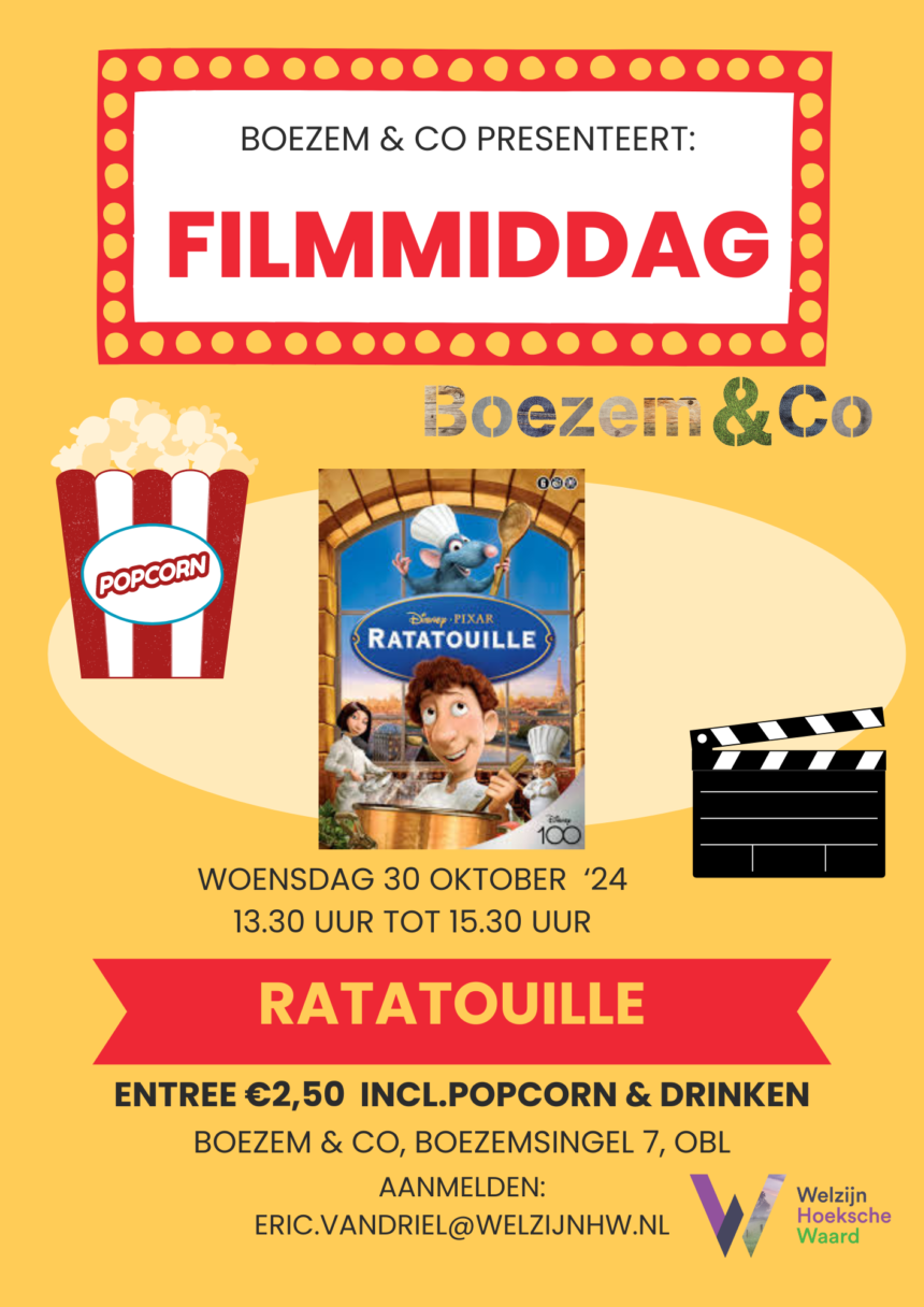 Om te vieren dat hetherfstvakantie is organiseren de vrijwilligers van Welzijn Hoeksche waard een filmmiddag voor kids in Boezem & Co, Boezemsingel 7 in Oud-Beijerland. We draaien de film ‘Ratatouille’ van Disney die gaat over het ratje die in Parijs op een culinaire zoektocht is.
