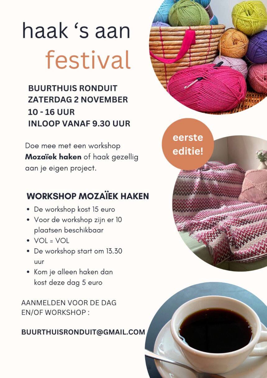 Op zaterdag 2 november 2024 vindt de eerste editie van het ’Haak ‘s aan Festival’ plaats in Buurthuis Ronduit. Het evenement duurt van 10:00 tot 16:00 uur, met inloop vanaf 9:30 uur.