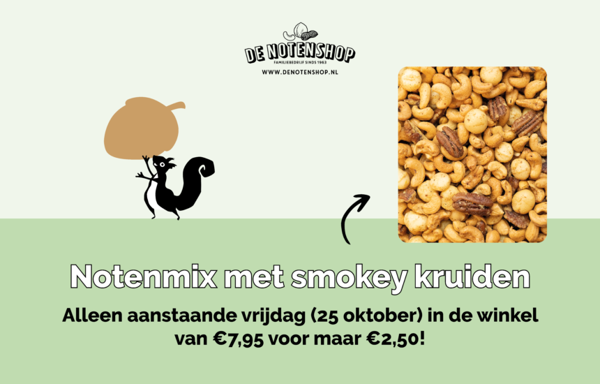 Alleen aanstaande vrijdag (25 oktober) kun je in de winkel van De Notenshop een speciale notenmix krijgen voor maar €2,50! De heerlijke notenmix bestaat uit cashewnoten, pecannoten en macadamia noten en bevat de lekkerste smokey kruiden. Let op: dit is eenmalig, dus grijp vrijdag je kans!