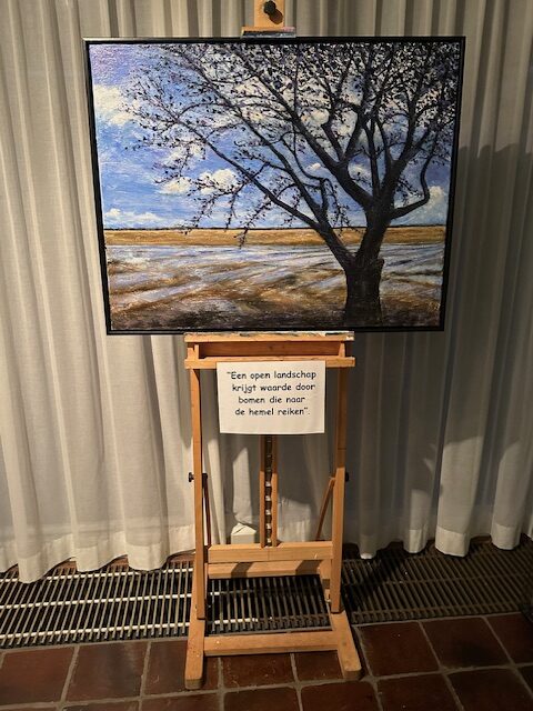 Op zondagmiddag 10 november is galerie De Opkamer, Merwedestraat 21, Maasdam open van 14.00-17.00 uur. Annemieke Vonk exposeert ondermeer met haar nieuwe schilderij gemaakt n.a.v. het thema: Een open landschap krijgt waarde door bomen die naar de hemel reiken.