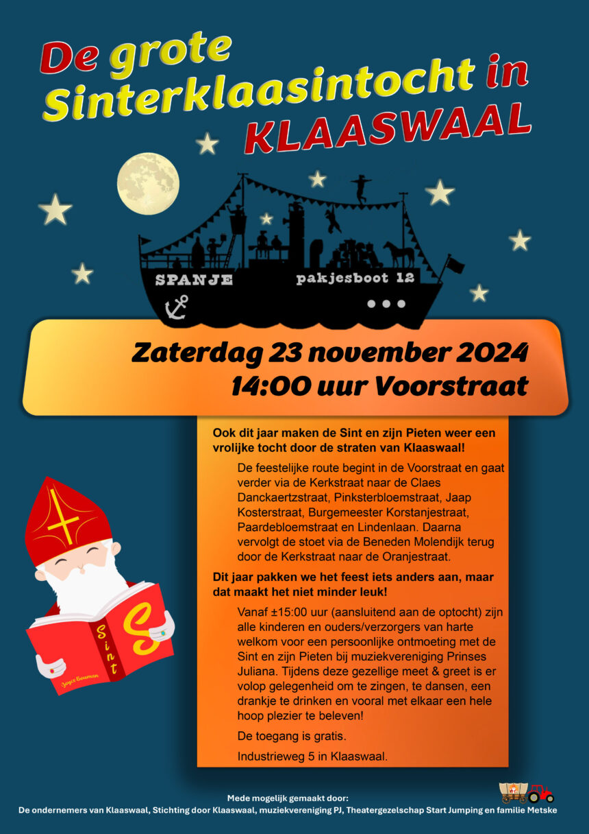 Op zaterdag 23 november 2024 zal Sinterklaas met zijn Pieten feestelijk aankomen in Klaaswaal! De intocht start om 14:00 uur in de Voorstraat, waarna de Sint en zijn Pieten een vrolijke route door de straten van Klaaswaal zullen afleggen. De stoet gaat onder andere langs de Kerkstraat, Claes Danckaertzstraat en andere straten, met uiteindelijk een terugkeer naar de Oranjestraat.