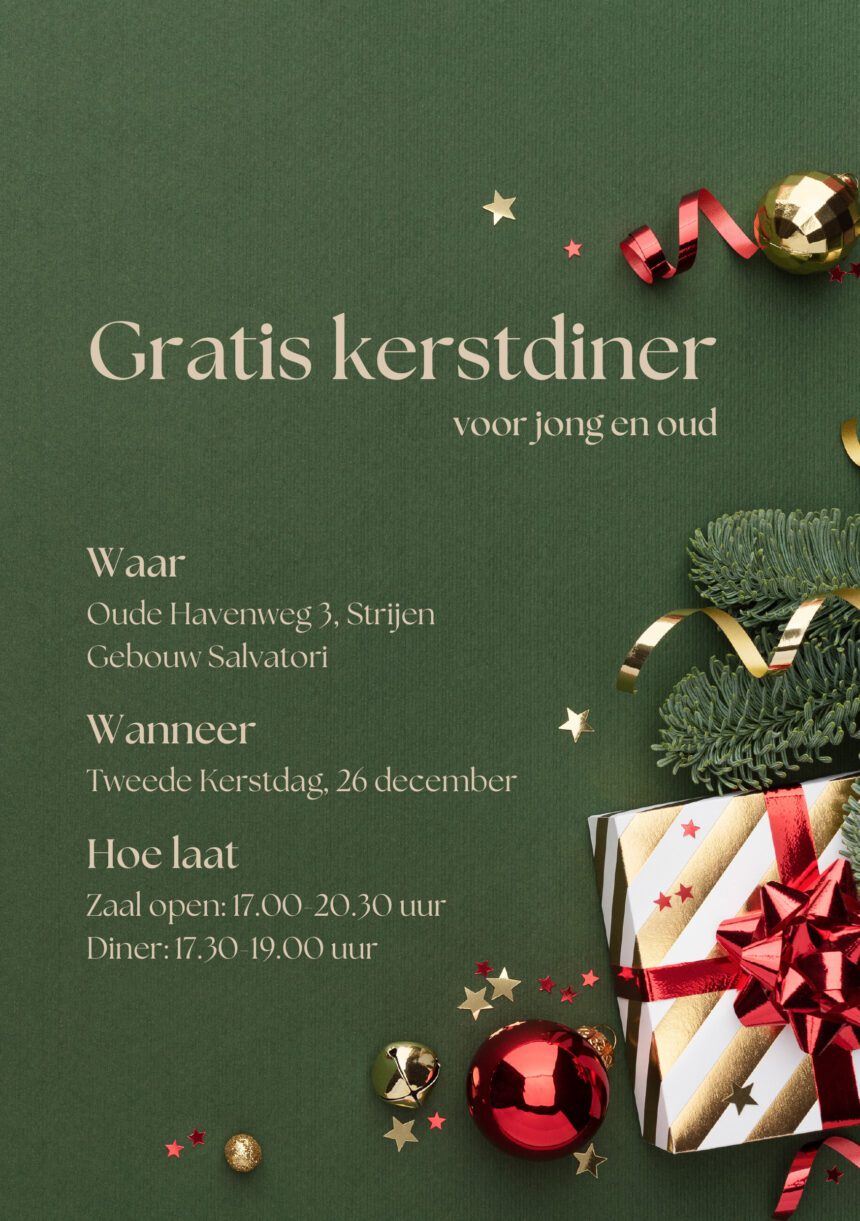 Dit jaar organiseren Coen en Naomi van Everdingen een gratis kerstdiner op Tweede Kerstdag, 26 december. Iedereen is welkom om samen te genieten van een warme maaltijd en gezelligheid in het Salvatori-gebouw aan de Oude Havenweg 3 in Strijen.
