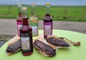 En bij een fles godendrank krijg je gratis een gerookte ganzenborst in de maand december (zolang de voorraad strekt). Deze godendrank hebben we in de smaken port (wit), vlier, braam, zwarte bes en kweepeer. Godendrank is een honingwijn, de oudste wijnsoort ter wereld. Gemaakt van goede honing en met bessen en fruit uit onze eigen tuin.