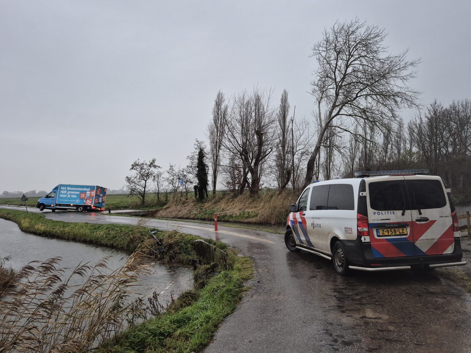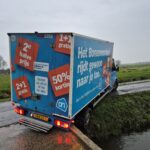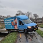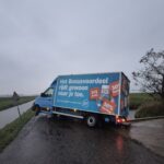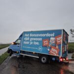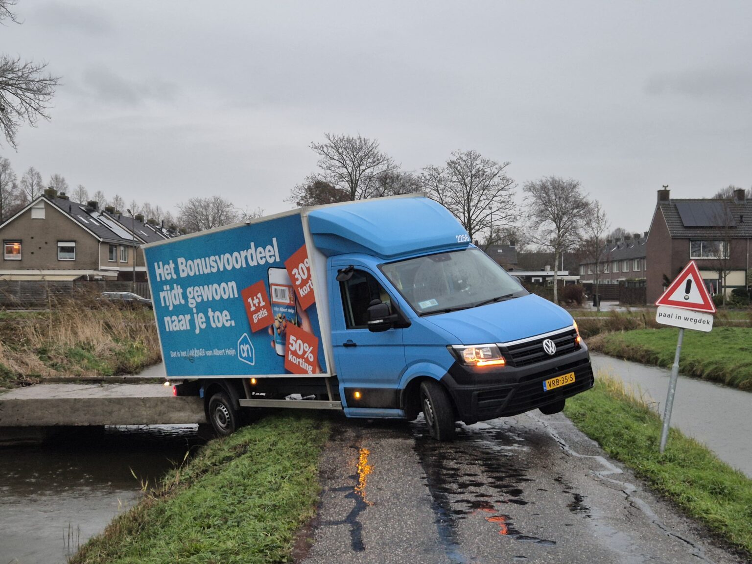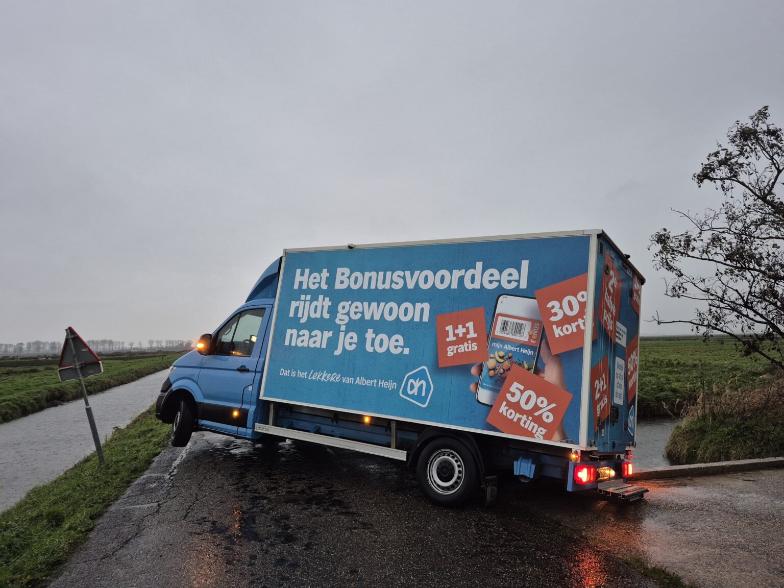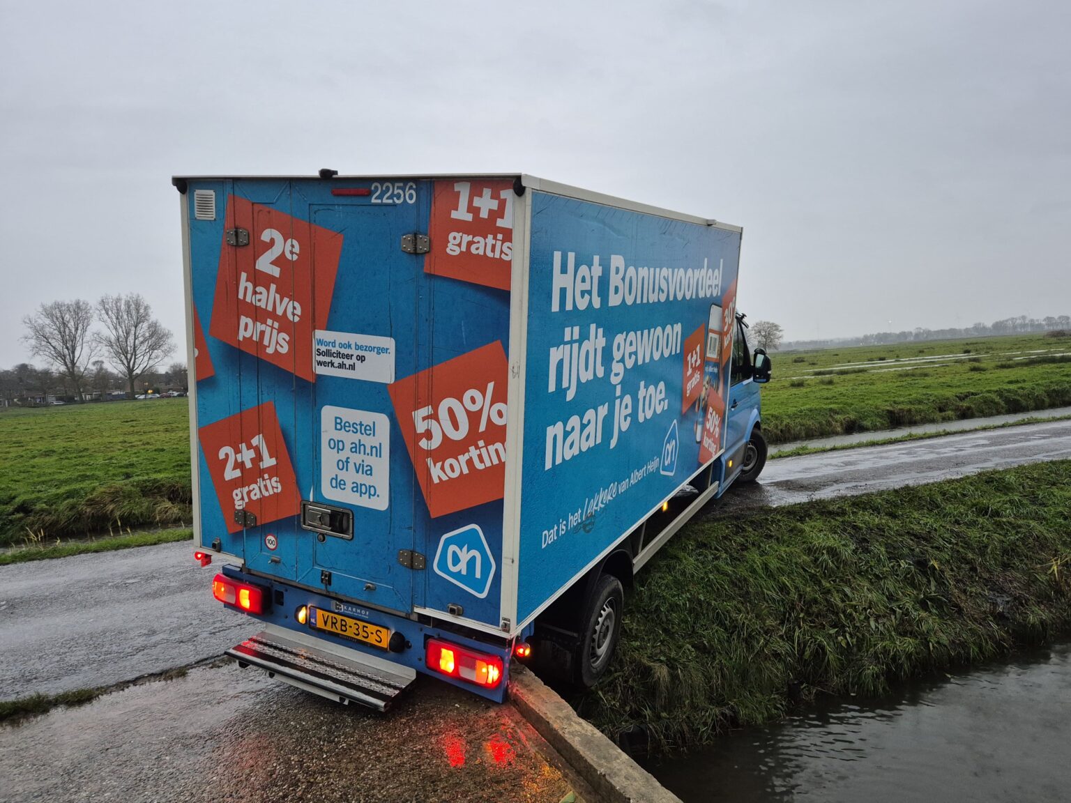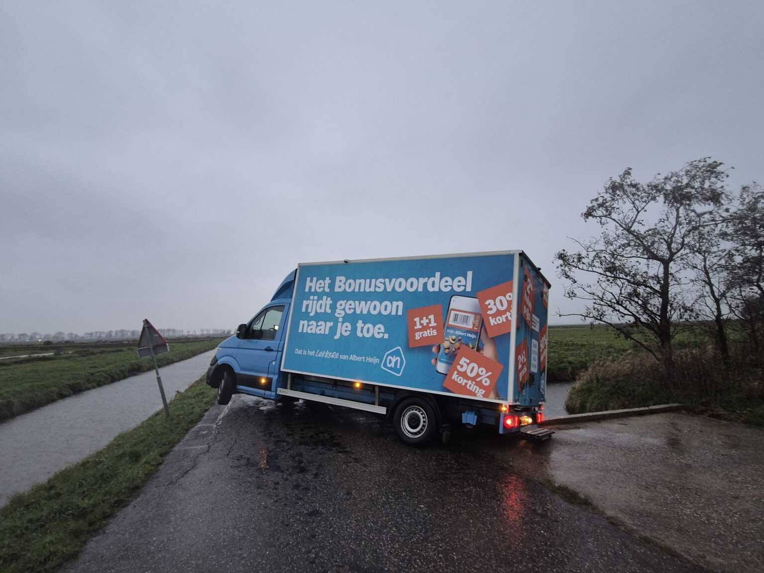 Een bezorgbus van Albert Heijn met de slogan “Het Bonusvoordeel rijdt gewoon naar je toe” kwam vandaag letterlijk vast te zitten in Strijen. De chauffeur reed per ongeluk de afgesloten Bovenweg op, wat resulteerde in een hachelijke situatie: het voertuig hing deels boven een sloot.