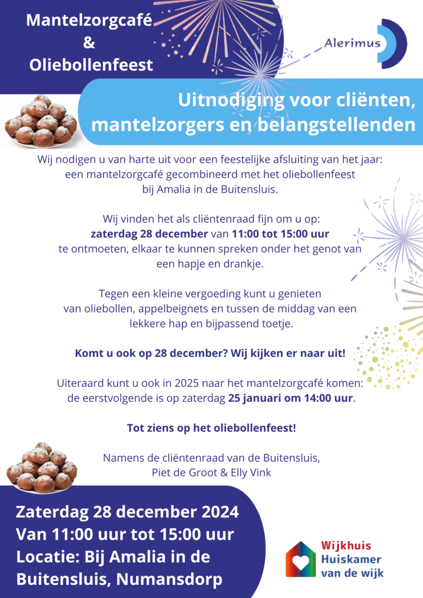 Op zaterdag 28 december organiseren Alerimus en de cliëntenraad een feestelijke afsluiting van het jaar met een Olliebollenfeest. Van 11:00 tot 15:00 uur is iedereen welkom in de Buitensluis (Bernhardstraat 25, Numansdorp) om samen het jaar af te sluiten onder het genot van een hapje en drankje.